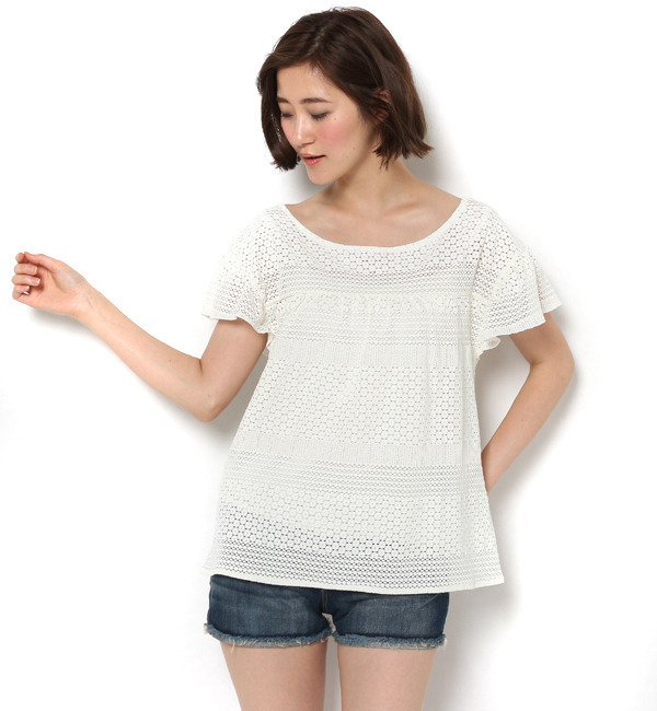【送料無料】 幾何学レースで仕上げたピュアな可愛さあふれるプルオーバーです。ふわりと揺れるフリルスリーブやフレアシルエットが、トレンド感をアピールしながら体型をさりげなくカバー。あえてデニムやショートパンツに合わせればヘルシーなガーリースタイルが完成します。 サンアイミズギラクエン/三愛水着楽園 トップス|プルオーバー,その他