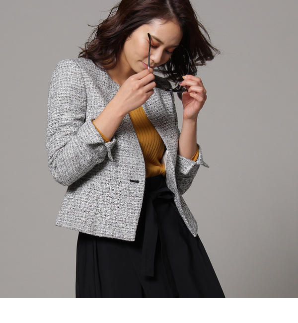 【送料無料】 ツイード素材のフォーマルな印象を、スッキリとクールなカラーレスのデザインで仕上げた、1ボタンのノーカラージャケット。ベーシックなノーカラーデザインのタイプより、甘くない雰囲気のものをお探しの方におすすめの一着です。素材は、上品に輝く華奢なラメを織り込み、ツイード素材の絶妙なカラーリングが、フォーマルな印象を高めます。より軽い着心地にこだわり、素材のストレッチ性や軽量化を実現。裏地もストレッチの効いたものを採用しました。生地は厚みやウォーム感を抑えているので、季節をまたいで使いやすいのも魅力のひとつ。オープンカフスで、袖は折り返してお召しいただけます。同素材のスカートやワンピースとのコーディネートはもちろん、単品スカートやきれいめシルエットのパンツとのコーディネートのしやすさにも配慮しました。サイズ違いの商品もご用意しております。L:153-44803モデル情報:身長166cm B80 W59 H86 着用サイズ:02店舗へのお問い合わせ商品番号:153-44103主に春に着用いただける商品です。 日本製 アンタイトル/UNTITLED UNTITLED|ジャケット・スーツ|ノーカラージャケット