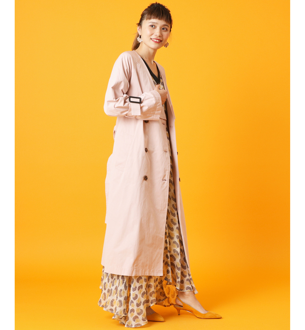 【送料無料】 春のスタイリングには欠かせないトレンチコート。Vネックのノーカラーでロング丈デザインなので大人な印象です。肩部分のエポレットがなく、抜け感の出せるデザインは女性らしくトレンドライクなデザイン。さらに華奢見せしてくれるのでスタイルアップな1枚です。やや長めの着丈は今季トレンドのひざ下ボトムにも合わせやすい丈感。ワイドボトムとの相性も◎です。幅広いスタイリングにマッチするトレンチコートは1着は持っておきたいマストアイテムです。 ミスティック/mystic omekashiline|アウター|トレンチコート