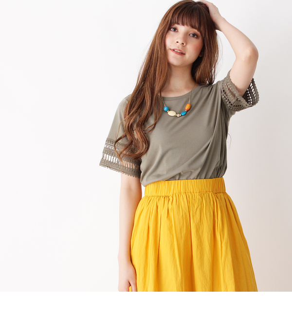 【3000円(税込)以上で送料無料】 袖部分にレースをあしらった大人可愛いプルオーバー。後ろの丈が少し長く、コクーンに仕上げているので、ヒップ周りがスッキリしたシルエットがポイント。前後差のある丈感でフロントインスタイルもキレイに決まります。モデル情報:身長168cm B75 W60 H87 着用サイズ:02(M)店舗へのお問い合わせ商品番号:768-12386主に夏に着用いただける商品です。 ベトナム製 グローブ/grove grove|トップス|Tシャツ・カットソー