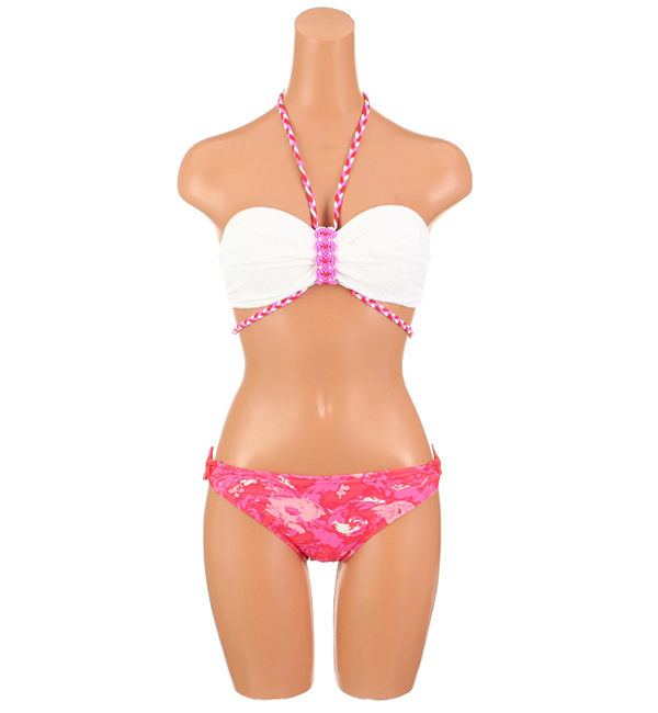 【送料無料】 デザインプリントのボトム×編み込みデザインでアクセントを効かせたブラトップのビキニセットです。ストラップを取り外せば、バンドゥとしても使用できるのが見逃せないポイント。手持ちのショートボトムスやパレオなどを合わせて、自分好みのアレンジを楽しむのもおすすめです。 サンアイミズギラクエン/三愛水着楽園 水着・スポーツ|ビキニ