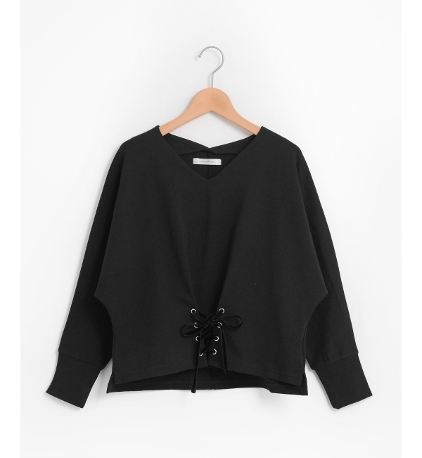 【送料無料】 フロント部分のレースアップリボンがアクセントになった大人フェミニンなプルオーバー♪首元のVネックがデコルテラインを綺麗に魅せ、女性らしさをより引き出してくれる一枚◎袖をあえて短めに設定することで、抜け感を演出したスタイリングもおすすめです。[ブラック]*摩擦や水濡れによる色落ち・色移りにご注意下さい。 ペルルペッシュ/Perle Peche トップス|Tシャツ・カットソー