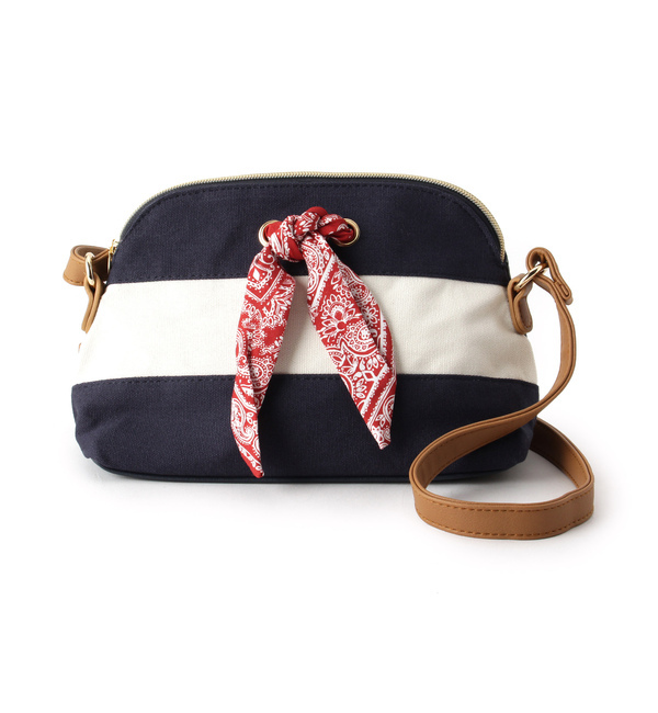 【送料無料】 バンダナ風リボンが目を引くボーダー柄ショルダーバッグです。フロントはキャンバス地の切り替えボーダー、バック面はレザー調素材を使用しました。トレンドの異素材ミックスアイテムです。バンダナの配色もオシャレ仕様☆店舗へのお問い合わせ商品番号:513-14044 中国製 ハッシュアッシュ/HusHusH HusHusH|バッグ|ショルダー・メッセンジャー