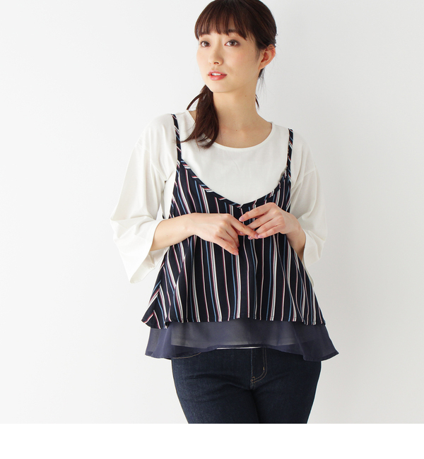 【3000円(税込)以上で送料無料】 ワイドスリーブのシンプルなプルオーバーとシフォン生地を重ねたストライプ柄のキャミソールがセットになったお得なアイテム。セットではもちろん単品使いできて着回しの幅が広がること間違いなし◎ ワイドボトムスと合わせて旬なスタイリングが楽しめます。モデル情報:身長169cm B75 W60 H86 着用サイズ:38(M)店舗へのお問い合わせ商品番号:763-13547主に秋に着用いただける商品です。 中国製 ピンクアドベ/pink adobe ピンクアドベ|トップス|キャミソール