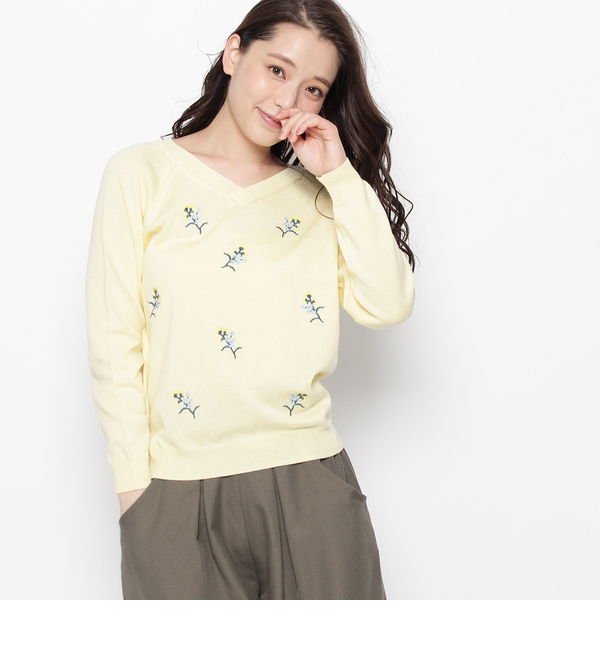 【3000円(税込)以上で送料無料】 華やかなフラワー柄の刺繍がシーズンムード漂うフェミニンなニットプルオーバー。すっきりと開いたVネックがデコルテをキレイに演出してくれます。キレイ目シルエットでどんなスタイルにも合わせやすく着回し力の高い1枚。モデル情報:身長168cm B80 W56 H84 着用サイズ:02(M)店舗へのお問い合わせ商品番号:768-12028主に夏に着用いただける商品です。 中国製 グローブ/grove grove|トップス|ニット・セーター