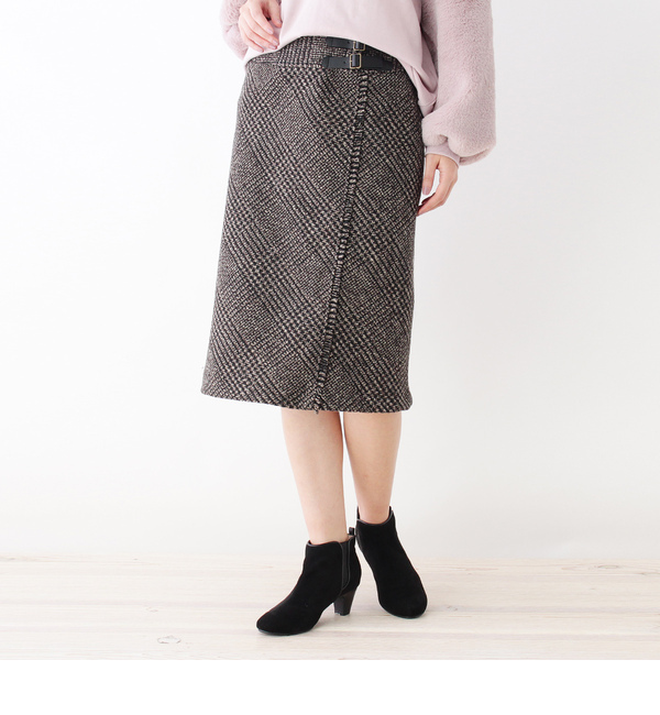 【送料無料】 ほどよく厚みと温かみのある生地で仕立てたツイードの台形スカートです。左サイドウエストのベルト使いとラッピングデザインが今年らしく、トップスはシンプルでも素敵なスタイリングに。どこかクラシカルさのある印象が今年のトレンドにぴったり!モデル情報:身長163cm B83 W63 H88 着用サイズ:02(M)店舗へのお問い合わせ商品番号:768-73031主に冬に着用いただける商品です。 中国製 グローブ/grove grove|スカート|スカート